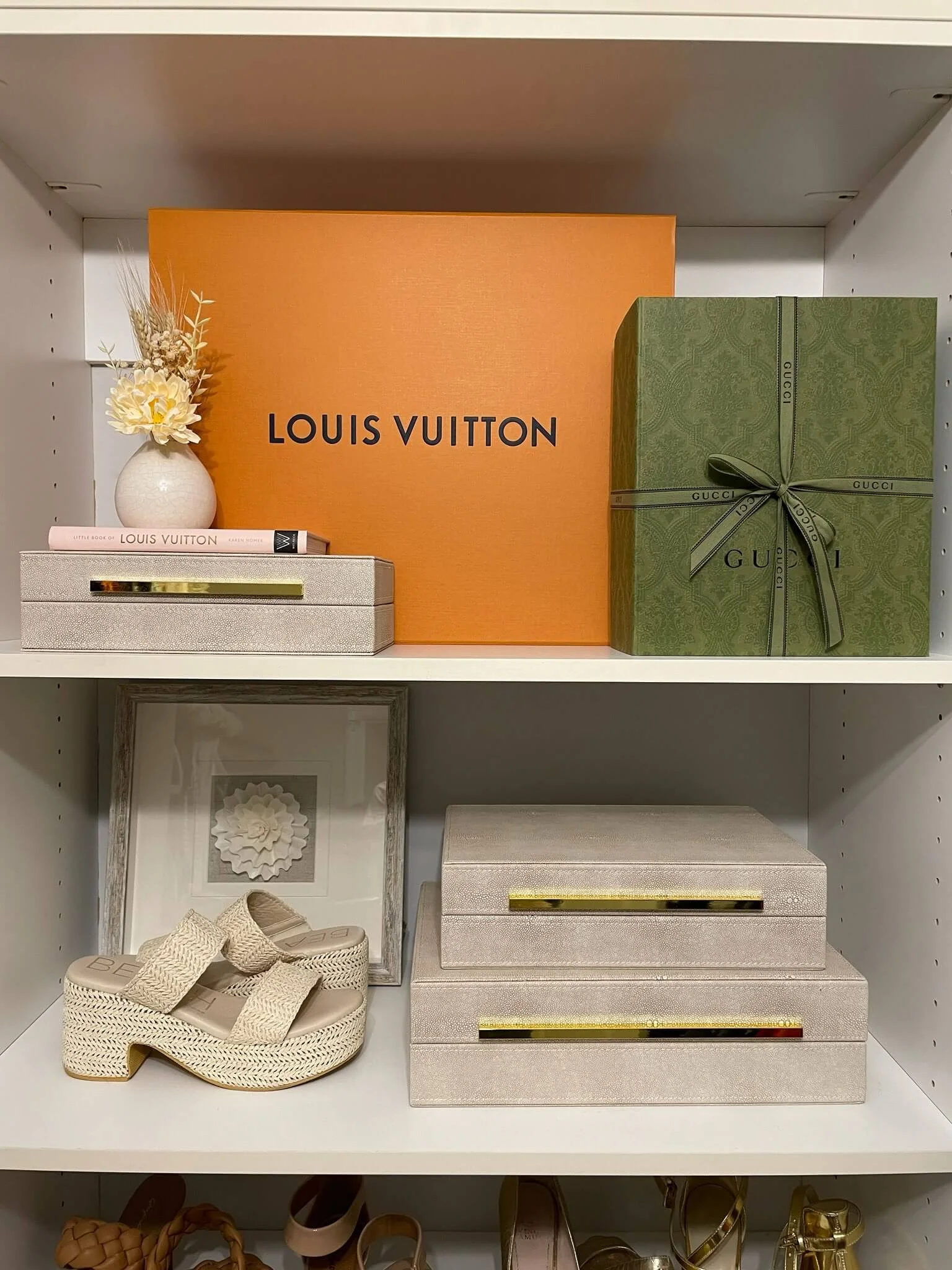 Our first step was to ensure that we had the essentials to make the closet both functional and aesthetically pleasing. We curated a collection of stylish organizers, including velvet hangers and storage bins made from wood, textured weaves, and canvas, to add dimension and warmth. This is your reminder that storage solutions don’t have to be ugly! The right materials can actually enhance and elevate a space, while adding an extra touch of style.